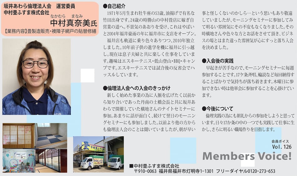 vol.124 入会後の実践は、職場の教養を使った毎朝の朝礼、トイレへ感謝を込めての清掃、プラス言葉を使う実践を行なっています。