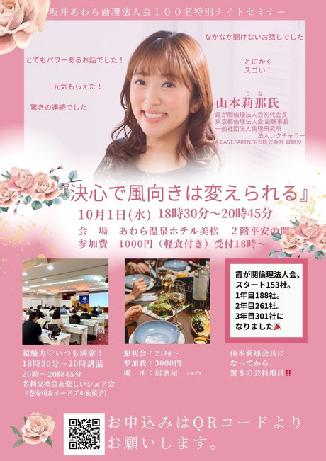 坂井あわら倫理法人会主催 100名特別ナイトセミナーが来る10月1日、夜の18時30分から開催予定です。